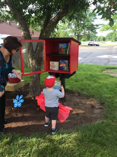 It features a nice selection of books for young children, to third grade. Borrow a book - return a book - donate a book!